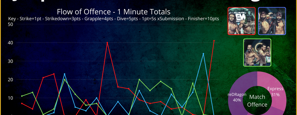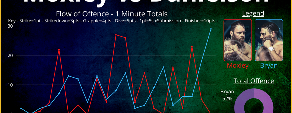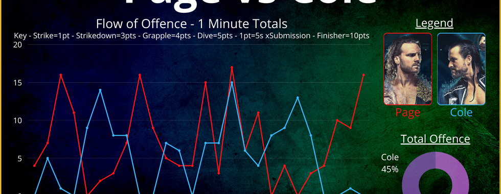 - All 4 matches had markedly different structures; MJF/Punk sold the struggle via declining action, Moxley/Danielson had the biggest use of peaks and throughs, Page/Cole had a remarkably consistent pace throughout with one distinct peak, and the 3-way tag had a constistenly frenetic pace with several big peaks.