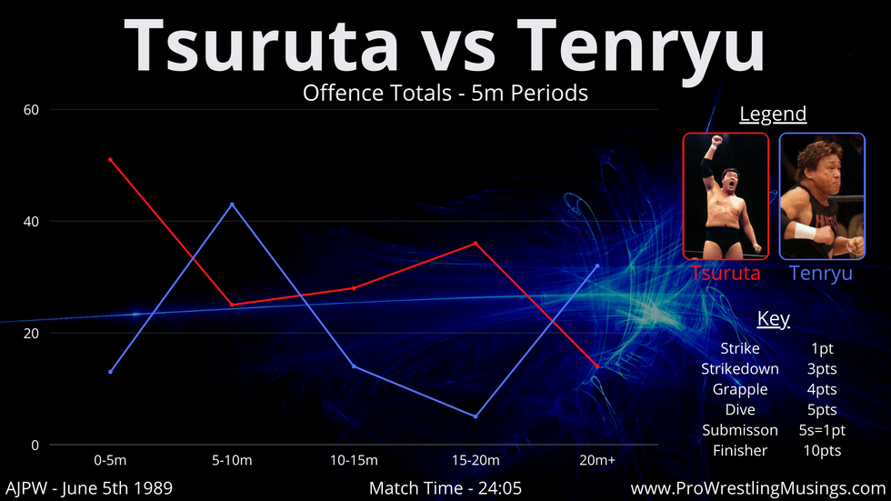 Jumbo's dominance was punctuated by large grinding submissions and a lead in each other offensive metric. Tenryu's underdog performance was underlined by a reversal differential, zero taunts and having less pin fall chances.