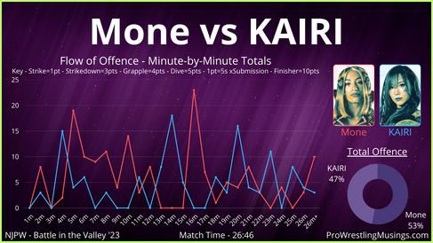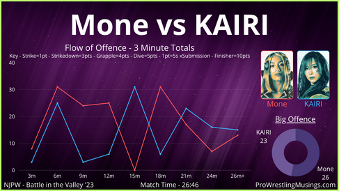 In the Flow of Offence charts, you'll see Mone had a chunk of time on top in the first portion of the match, before an exchange of large offence in the middle of the match, with her having to overcome a KAIRI period of control towards the end.