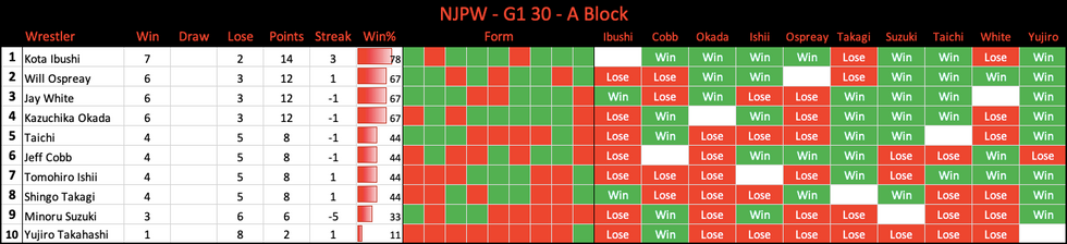 Three block wins in a row and two G1 Climax wins in a row sets up a potential second IWGP Championship shot at Wrestle Kingdom in a row. Kota Ibushi started hot and maintained that until the end, only slipping up twice.