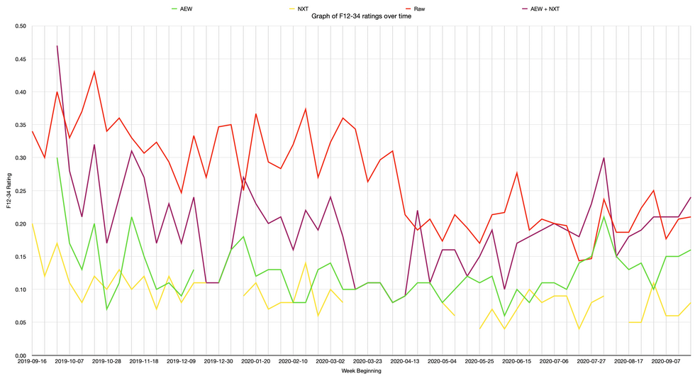 NXT had a similar week to AEW, down slightly but nothing too concerning, although they are well into the build to their fun surprise TakeOver so I think they'd like to comfortably be in the 700k/0.2 range this close. In P2+ they were actually up 1.0% (689k to 696k) and in P18-49 they stayed level at 0.18. Just like AEW there's no major changes among the granular demos, but you can read below to see how they fared